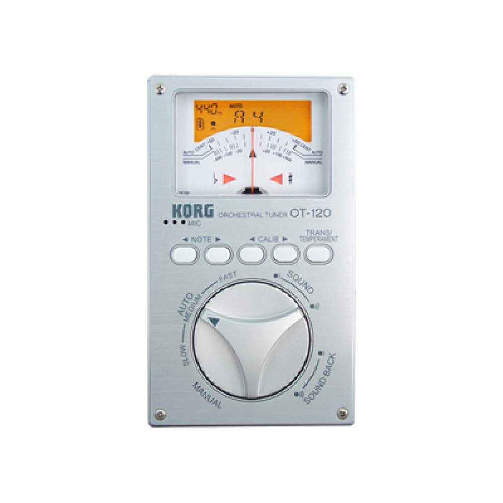 El Korg OT-120 es un afinador cromático avanzado diseñado para músicos de orquesta. Ofrece un amplio rango de afinación (A0-C8) y soporta múltiples instrumentos, desde cuerdas hasta viento. Su pantalla combina un medidor de aguja de alta precisión con un LCD retroiluminado para facilitar la afinación en diferentes entornos. Incluye transposición para 12 tipos de clave, soporte para temperamentos históricos y una calibración ajustable (A4=349-499 Hz). Su modo Sound Back permite afinar visual y auditivamente. Funciona con pilas AAA o adaptador CA (opcional).
