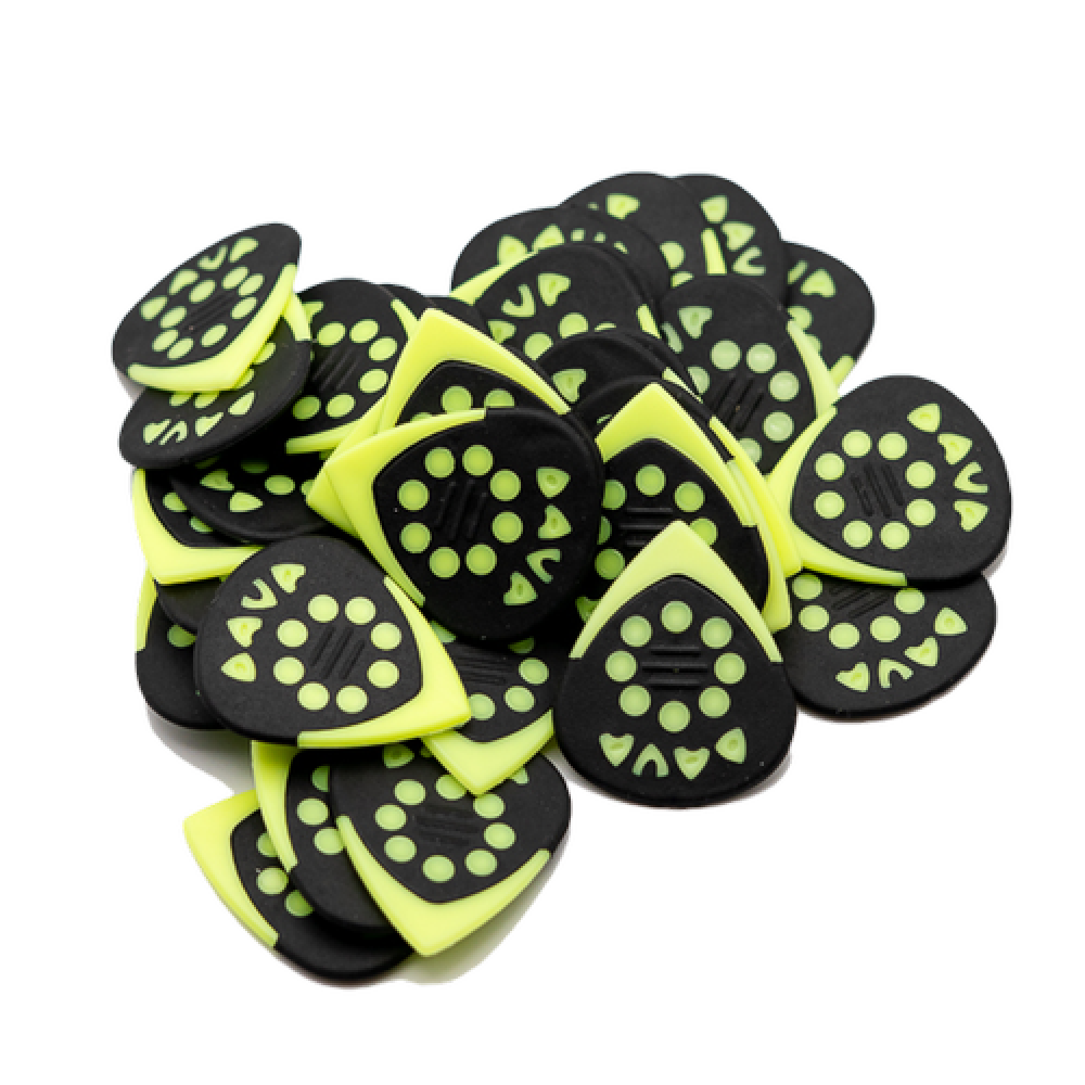 Bolsa de 36 púas de nylon Dava Control Jazz Grips. Estas púas de nylon cuentan con una punta afilada y empuñadura de goma para mayor control y precisión en las ejecuciones de las piezas