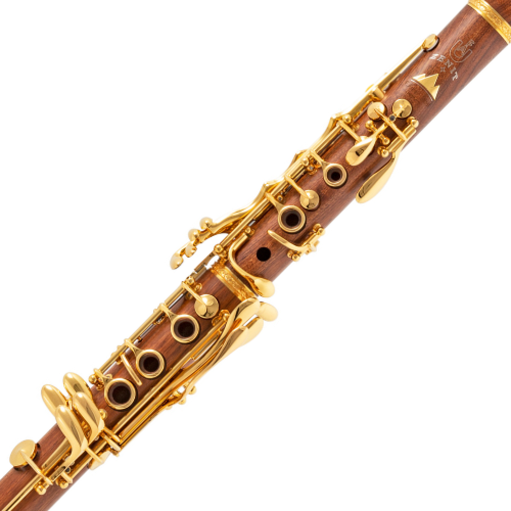 Clarinete Sib fabricado en madera de mopane, con taladro "Zenit" que favorece una proyección precisa. Equipado con 18 llaves y 6 anillos, presenta pilares y llaves chapados en oro de 24 quilates, además de una ornamentación floral en anillo metálico fundido y sello de plata de ley incrustado.