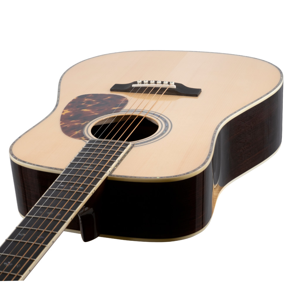 Tapa de pícea Adirondack sólida AAA para un tono cálido y potente. Fondo y aros de palisandro de la India macizo para graves y profundidad tonal. Binding y rosetas de abulón que llaman la atención en el cuerpo. Diapasón y clavijero ribeteados para completar la estética. Músicos de todo el mundo se han enamorado del sonido de alta gama de nuestras guitarras Tonewood Reserve. La combinación clásica de pícea Adirondack y palisandro macizo ofrece un tono acústico tradicional para músicos de bluegrass, flatpickers y compositores. Hemos subido la apuesta con la serie Dreadnought Elite de Tonewood Reserve, que presenta todo lo bueno de la Tonewood Reserve con detalles estéticos mejorados para un estilo boutique de alta gama. La serie Dreadnought Elite de Tonewood Reserve ofrece la potencia y la proyección que los músicos esperan de una guitarra dreadnought de primera categoría. Graves completos y agudos cristalinos, similares a los de un piano, caracterizan el gran tono de esta potente guitarra de cuerpo grande. Destaca entre la multitud, acompaña tu propia voz o presume de tu destreza con el flatpicking con este llamativo elemento de conversación. En respuesta a las solicitudes de los músicos que tocan flatpicking, la TWR Elite Dreadnought tiene un ancho de cejuela de 1-¾” para tocar con comodidad.