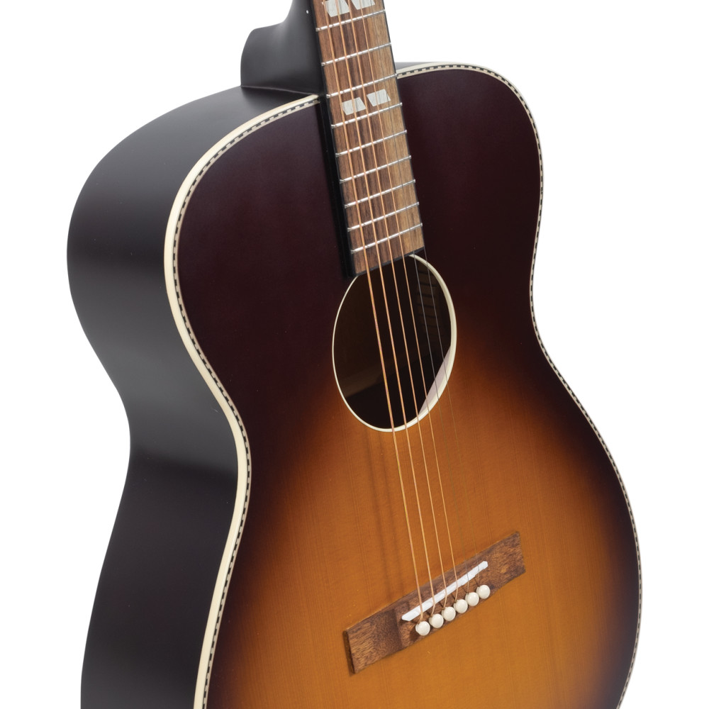 Tapa de abeto.Escala de 25,4".Refuerzos Cross Lap Cejilla y selleta de hueso. La Serie 7 000 de Dirty 30s ofrece un sonido acústico robusto con una respuesta uniforme en todo el diapasón. Con nuestro refuerzo Cross Lap superlimpio y materiales de primera calidad, la Serie 7 es una de las guitarras acústicas con mejor sonido disponibles. La tapa de abeto proporciona la base para un sonido acústico clásico, y el acabado sunburst en tabaco, el ribete del cuerpo de color marfil y la boca ribeteada le dan a la Serie 7 000 una estética vintage. Los marcadores de diapasón con plantilla de paralelogramo completan el estilo. Los accesorios de calidad incluyen una cejuela y un puente de hueso y clavijeros de botón de marfil. La Serie 7 000 combina el sonido tradicional del cuerpo 000 con un estilo clásico