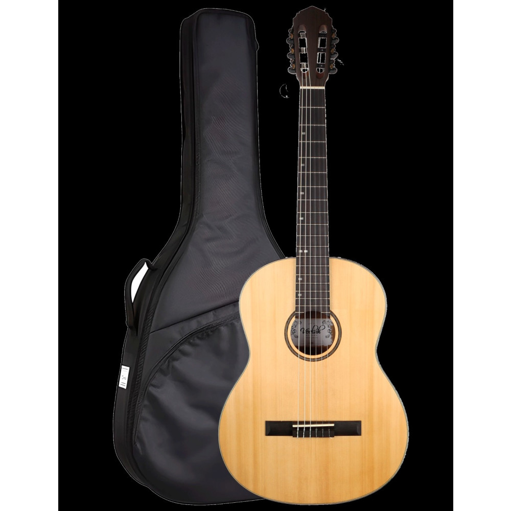 La guitarra clásica Veelah CS destaca por su tapa de abeto, que ofrece una proyección sonora clara y equilibrada. Su fondo y aros de caoba aportan calidez tonal y una respuesta suave ideal para estilos clásicos o melódicos.