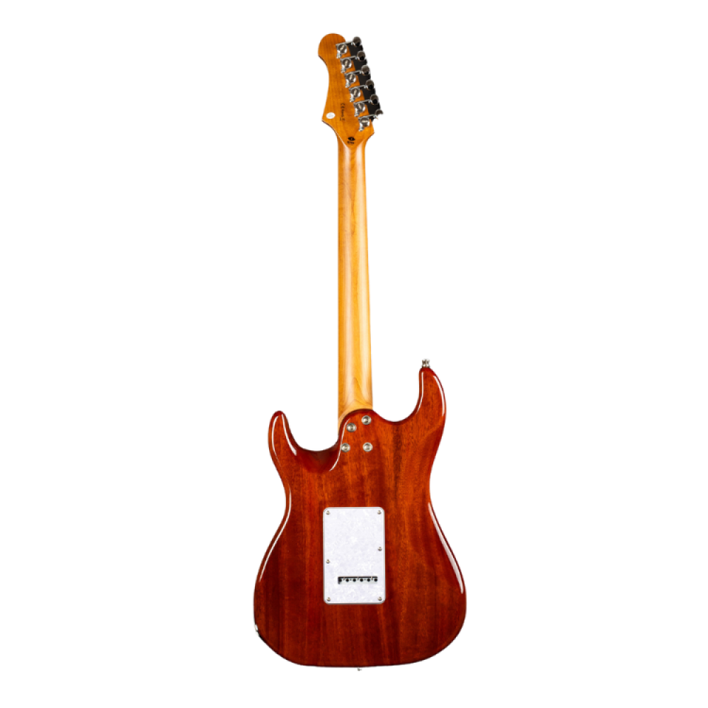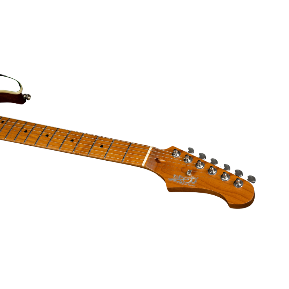 La JET JS-600 TGR es una guitarra eléctrica de la serie 600 de JET Guitars, reconocida por su tono cálido gracias a su cuerpo de caoba con tapa de arce flameado. Equipada con pastillas HSS Alnico, ofrece versatilidad sonora para diversos estilos musicales. Su mástil de arce canadiense tostado en forma de "C" moderna y diapasón de arce tostado proporcionan una experiencia de interpretación cómoda. Incluye un puente Wilkinson Tremolo y afinadores con bloqueo para una afinación estable.