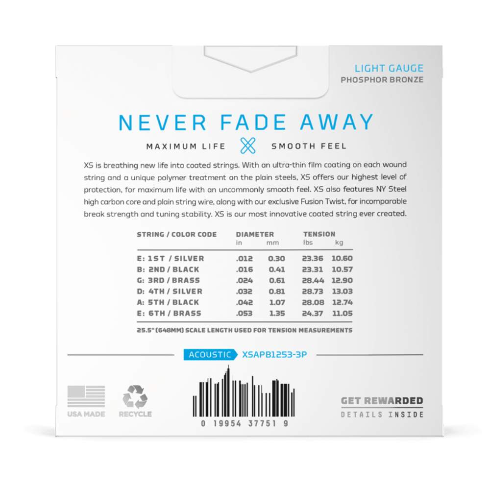 El juego de cuerdas para guitarra acústica D’Addario XSAPB1253-3P lleva un entorchado en bronce fosforado con recubrimiento XS para una duración extrema y un tacto ultra suave. Su núcleo de acero NY y tecnología Fusion Twist ofrecen una estabilidad de afinación superior y una gran resistencia a la rotura.