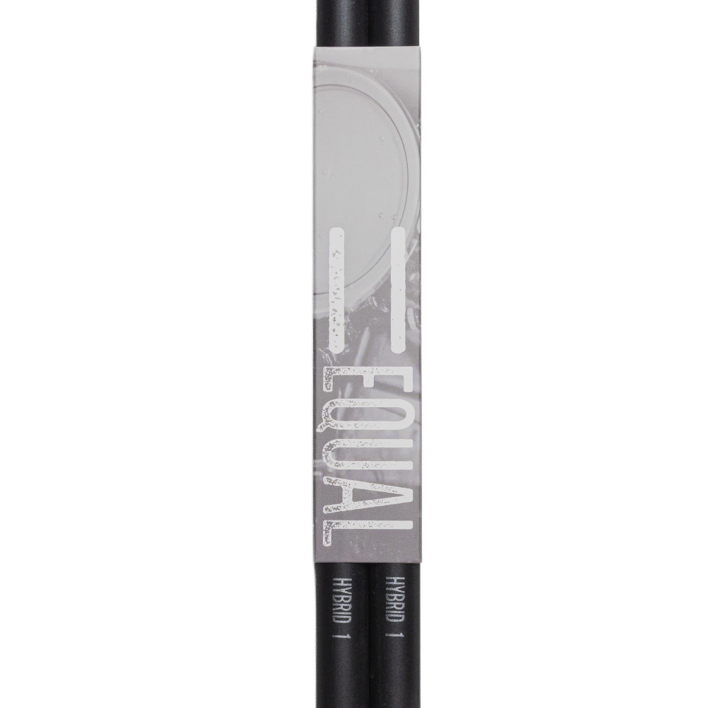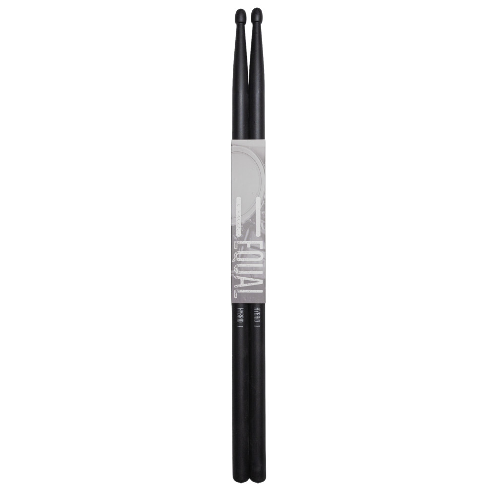 Par de baquetas Equal Hybrid H1 fabricadas en fibra de carbono negra, con medidas tradicionales que ofrecen una sensación familiar al intérprete. Su construcción permite una durabilidad excepcional frente al desgaste intensivo.