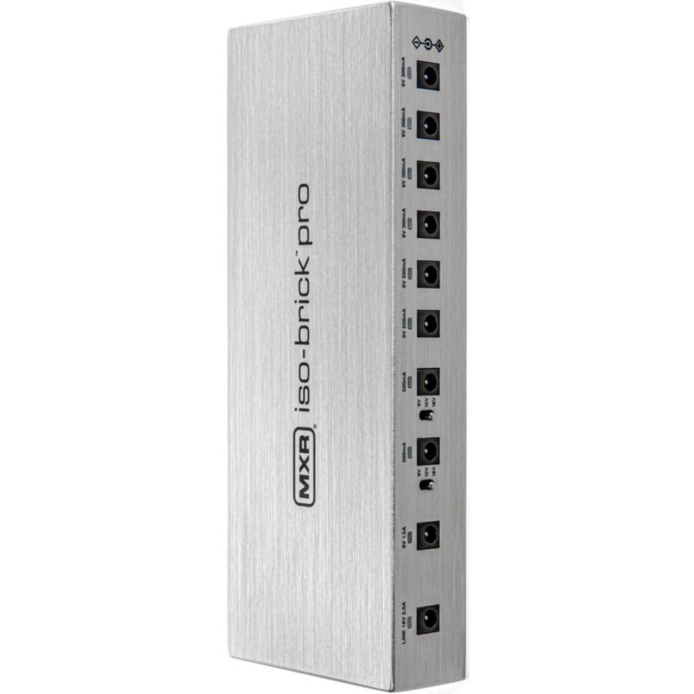 La fuente de alimentación MXR Iso-Brick Pro M242 ofrece diez salidas completamente aisladas, diseñadas para alimentar desde pedales analógicos de baja demanda hasta unidades digitales de alta potencia. Su diseño compacto permite su instalación debajo de la mayoría de las pedalboards estándar, facilitando una configuración ordenada y eficiente.