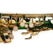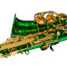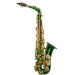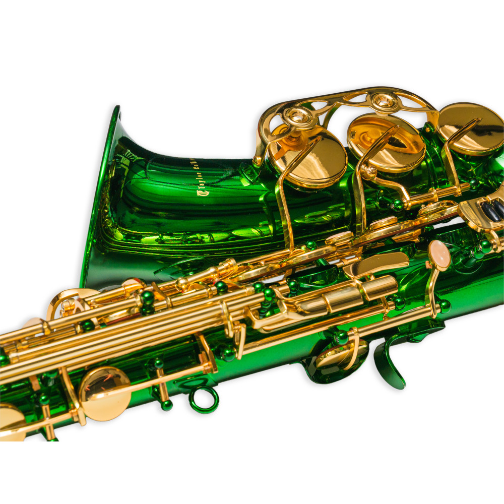 Saxo Alto de estudio en acabado lacado verde con llaves doradas Afinación en Mib con Fa# agudo Incluye paño de limpieza, guantes y correa Incluye estuche Omebaige