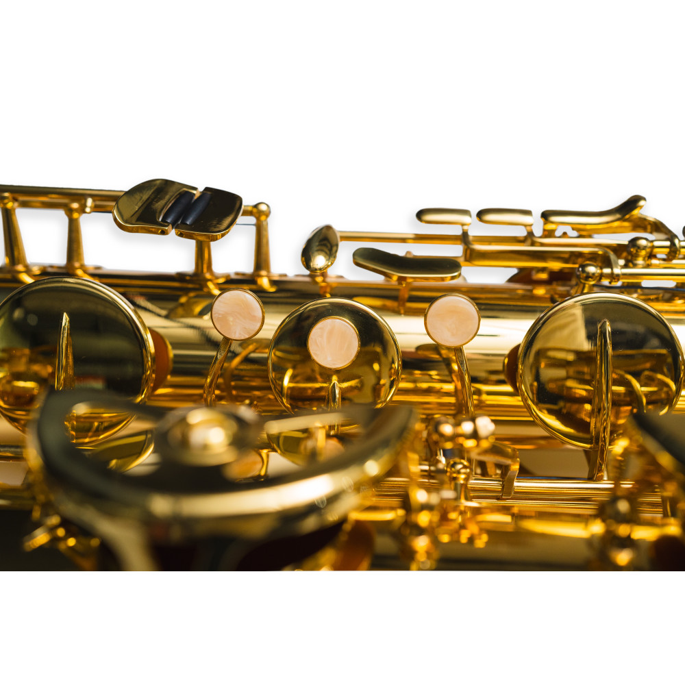 Descubre el poder y la elegancia de nuestro saxofón barítono en Mi♭. Con un rango completo desde La bajo hasta Fa# y fabricado en latón de alta calidad, este instrumento combina durabilidad con un tono profundo y resonante. La superficie lacada no solo le da un acabado brillante y atractivo, sino que también protege el saxofón para una larga vida útil.