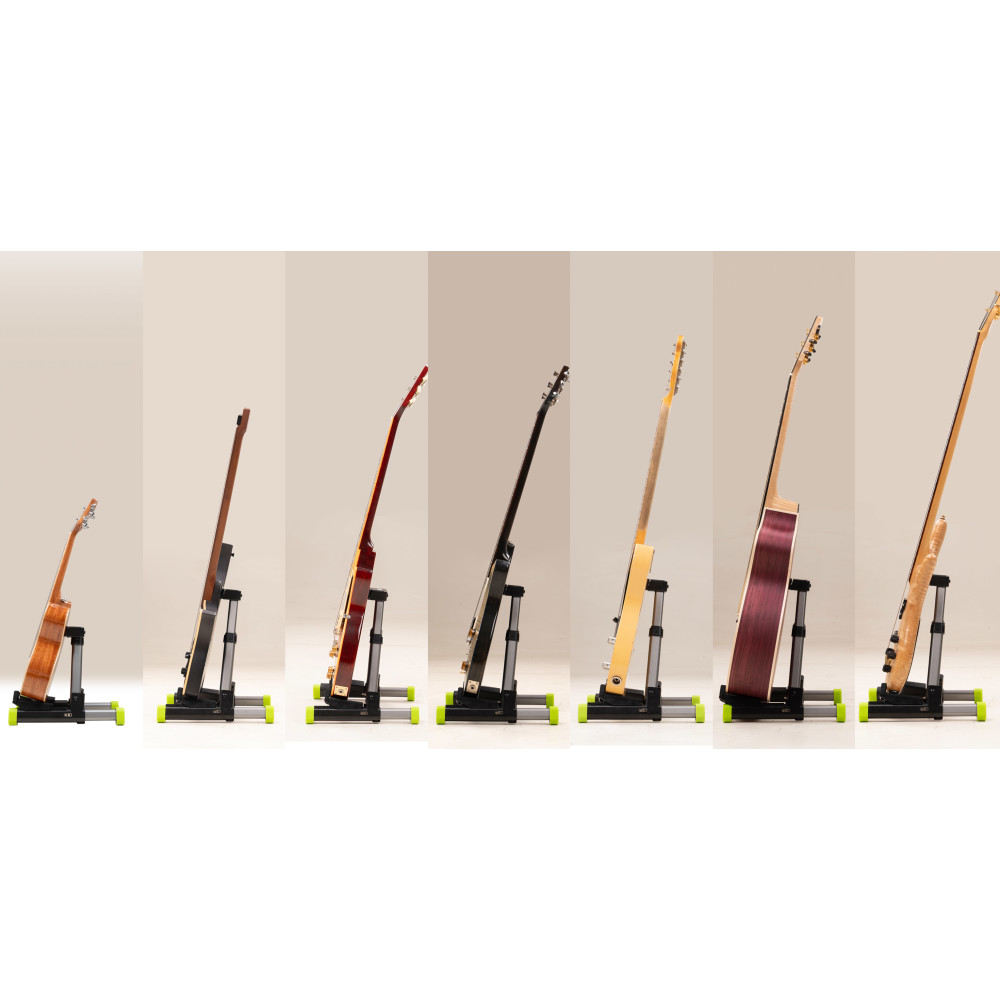 Fabricado con tubos de aluminio ligeros y almohadillas de silicona, combina durabilidad con cuidado para el instrumento. Sus patas traseras extensibles, bandeja móvil y respaldo con resorte permiten adaptarse a guitarras acústicas, eléctricas, bajos e incluso ukeleles, asegurando estabilidad en todo tipo de cuerpos, incluidos los asimétricos.