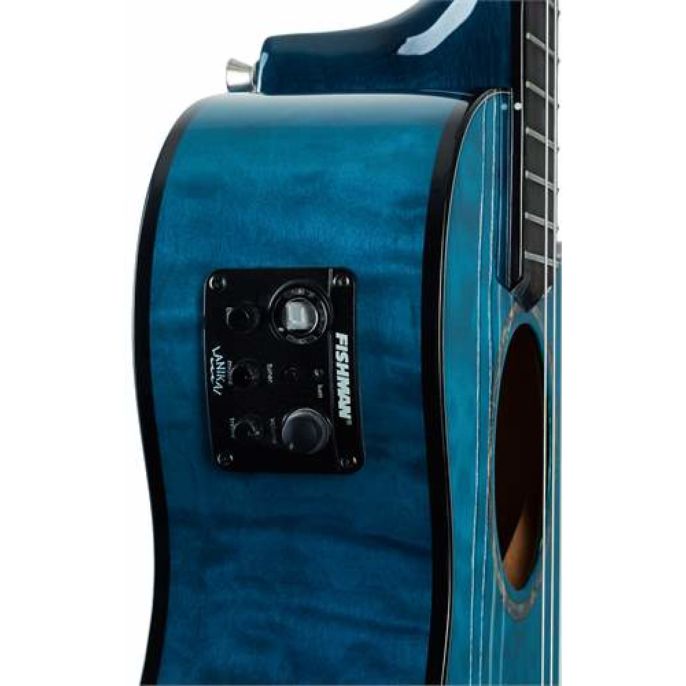 - Tapa, fondo y aros: Arce acolchado - Cutaway: Sí - Preamplificador: Fishman Kula con afinador- Ancho de cejuela: 38,8 mm - Escala: 514 mm - Trastes: 18- Diapasón: Laurel - Afinadores: Grover Nickel, open back- Cejuela y selleta: Graph Tech NuBone XB- Cuerdas: D'Addario EJ88- Binding: Black multiply ABS - Roseta: Abulón- Acabado Brillante- con estuche de espuma